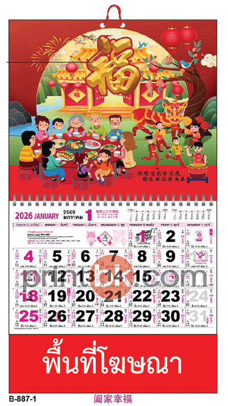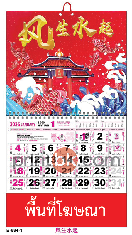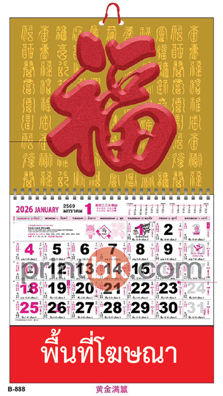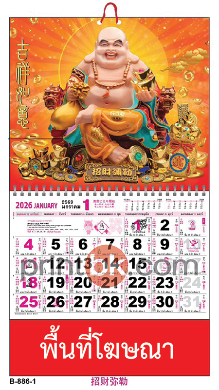 | ปฏิทินโชคดี ขนาด 14.25 x 24.5 นิ้ว ด้านบน รูปมงคล พิมพ์บนกระดาษหนาอย่างดี เป็นภาพ 4 สี + ปั้มทองเค พร้อมเคลือบยูวี ด้านล่างส่วนวันที่พิมพ์บนกระดาษปอนด์อย่างดี ปฏิทินแบบรายเดือน จำนวน 12 แผ่น พร้อมปกหลังอย่างหนาสีแดง สำหรับพิมพ์ข้อความโฆษณาสีขาว |